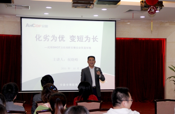 祝曉峰總助用SWOT分析法,理論聯系實際,全面、生動地分析了安糧實業,乃至公司整個貿易板塊所面臨的環境、優勢和劣勢,闡述了公司發展的機會與挑戰,為廣大業務和管理人員開啟了思路,提供了有益的借鑒。