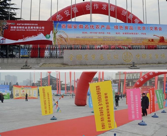 本次農交會由安徽省人民政府主辦的,為期三天,其主題為“生態安徽、合作發展、創新崛起”,來自全省16個地市的優秀農產品企業以及省級農民合作示范社共760家齊聚一堂。位于全國農業展覽館正門上方的安糧實業大幅廣告牌以及廣場上印有公司名稱的彩旗格外引人注目。