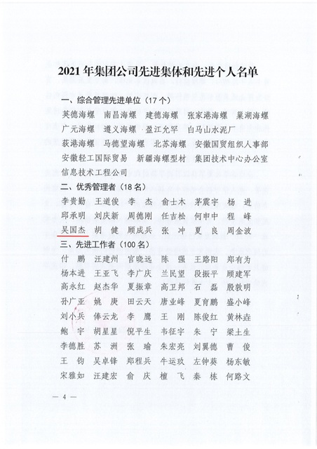 公司4人榮獲海螺集團2021年先進表彰